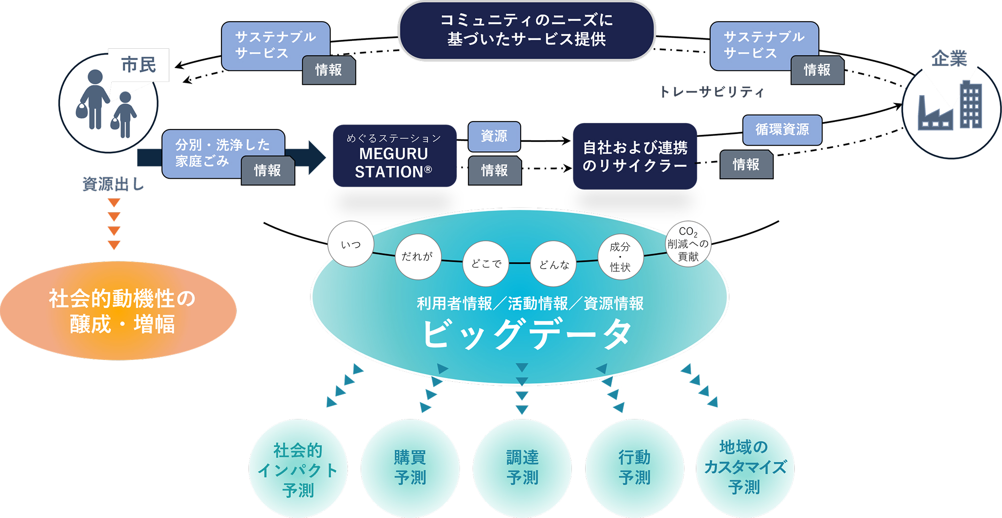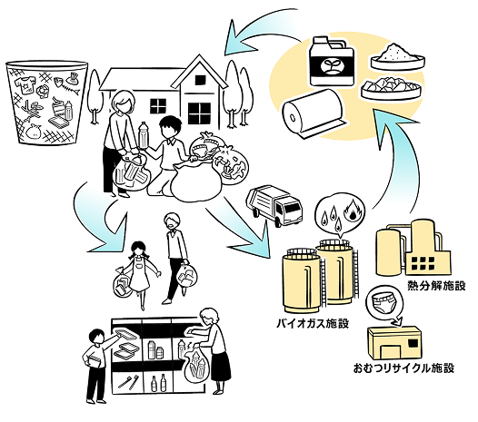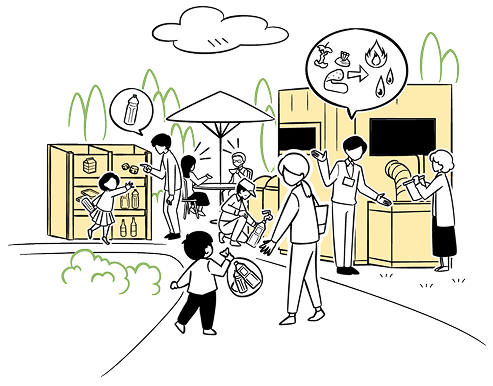 地域住民による資源(家庭ごみ)を分別・回収し、企業と協力して、資源循環を促進。将来的には、資源回収を通じて得られる情報を社会に提供し、生産・利用の最適化を通じて無駄のない社会の実現を目指しています。