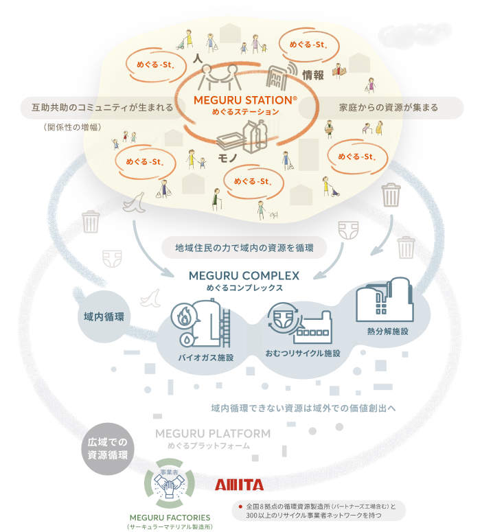 豊かな関係性と資源循環を同時実現する「MEGURU STATION®」、資源をできる限り無駄なく循環させる新たなサーキュラーモデル「MEGURU COMPLEX」、データを活用して最適な資源管理を目指す「MEGURU PLATFORM」。3つの要素が相互に作用することで「関係性の増幅」と「循環の促進」の基盤をつくります。